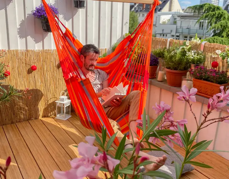 Le nostre fibre funzionali sono state sviluppate appositamente per resistere alle sollecitazioni cui sono sottoposte le amache appese all’aperto. Il tessuto è facile da pulire, resistente alle intemperie e si asciuga velocemente.