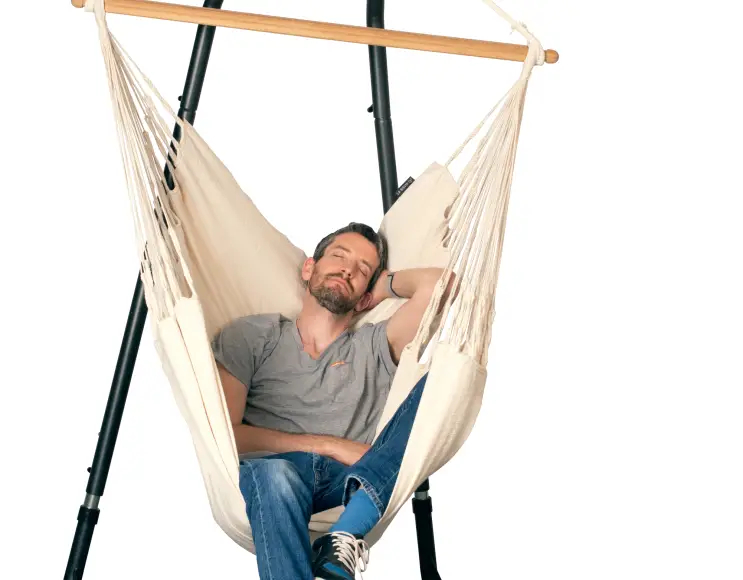 Grazie al sistema ad anello con moschettone, la sedia pensile può essere agganciata rapidamente all'altezza desiderata.